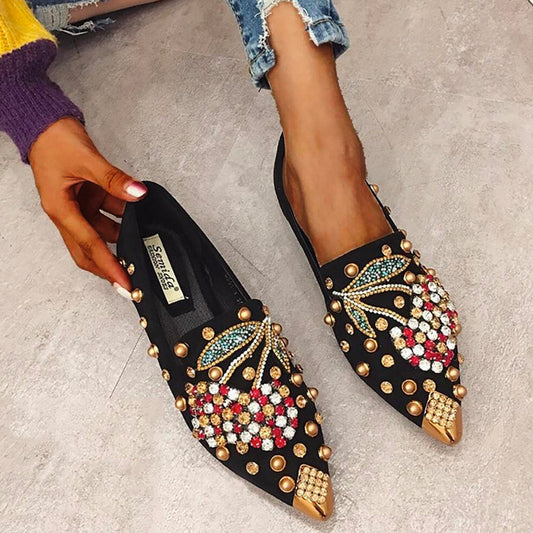 Daphne Luxurious Rhinestone Cherry Metal Pointed Toe Flat Shoes